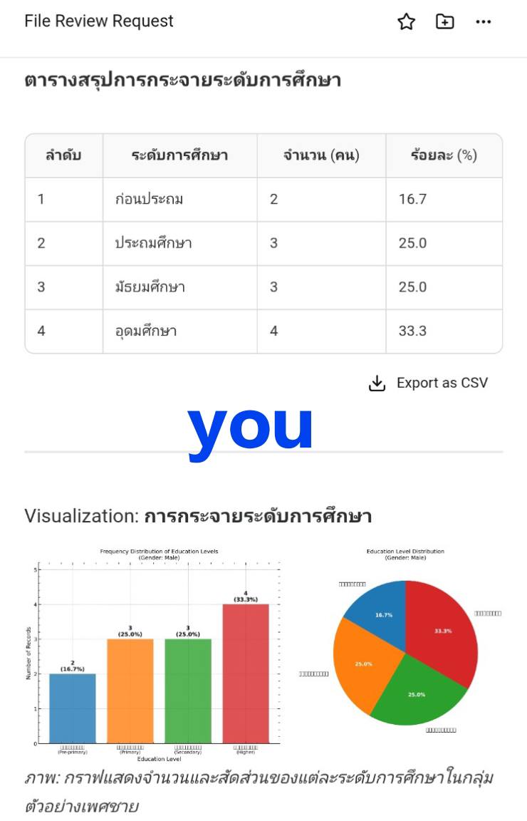 แฟ้ม .sav หรืออื่น ๆ ที่ เอไอ ยังไม่รองรับ อไอ มีความสามารถในการ generate ข้อมูลมาให้เราอย่างเหลือล้น แล้วพบว่า เราสามารถอัพโหลดข้อมูล เพื่อประกอบการประมวลผลไปร้วมกับ prompt ในหลายรูปแบบ แต่บางรูปแบบ เช่น .sav ซึ่งมีลักษณะเฉพาะที่ไม่มี library ของบริษัทผู้พัฒนา ((spss)) สนับสนุนในเอไอ ส่วนรูปแบบ .csv นั้น เอไอสามารถเข้าใจได้ ทั้งแบบแนบต่อท้ายโพสต์ไปกับเนื้อหาใน prompt หรือ upload file แต่มีข้อจำกัดเรื่องจำนวนรายการ เช่น 400 รายการ (taro yamane) พบว่า เอไอที่ได้ทดสอบ 5 ตัว ไม่มีตัวใด สามารถประมวลผลได้อย่างมีประสิทธิผล
