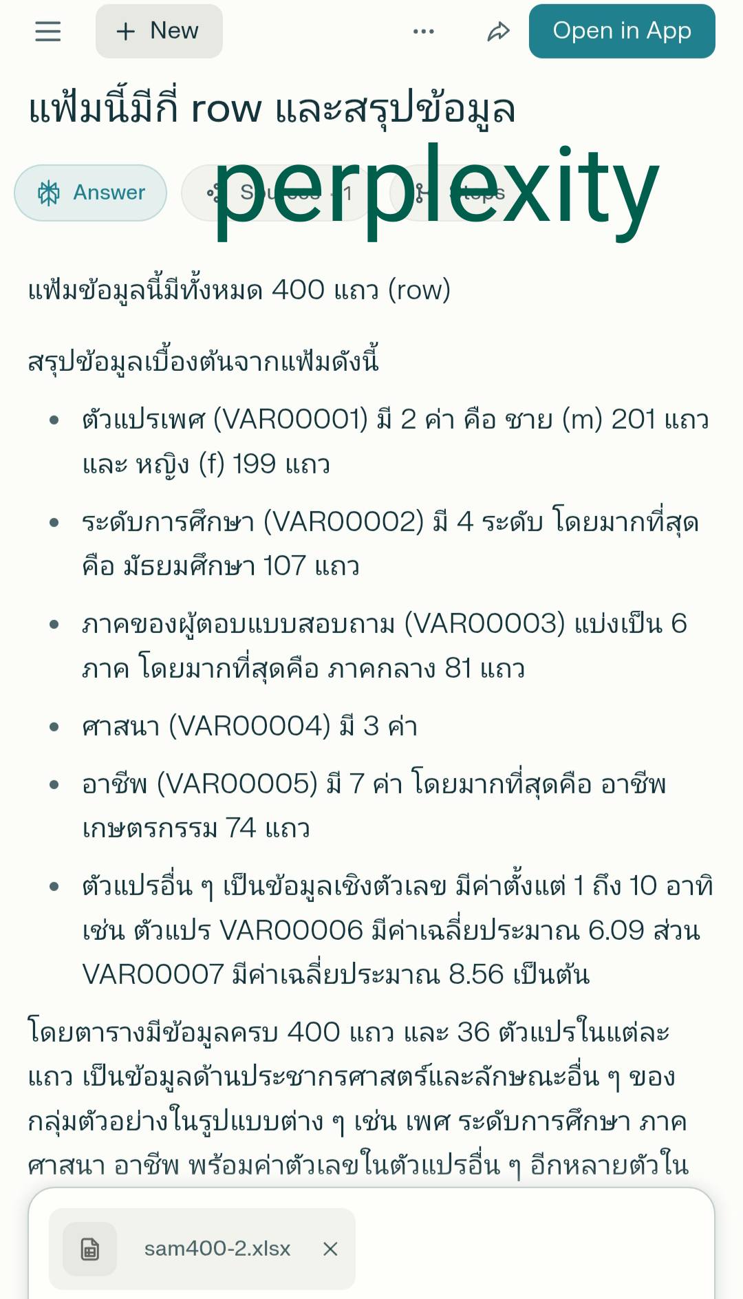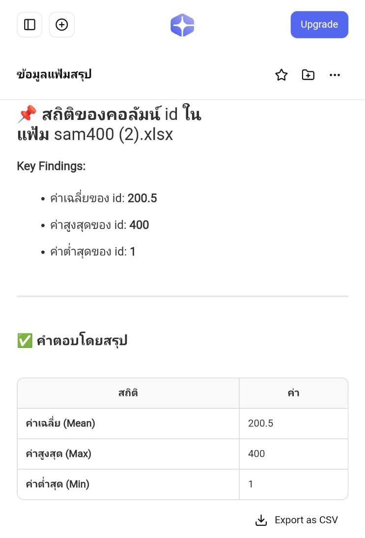 การประมวลผลข้อมูลจากแฟ้ม excel ารประมวลผลข้อมูลจากแฟ้ม excel พบว่า เอไอ หลายตัว รับแฟ้ม xlsx ได้ แล้วประมวลผลข้อมูลใน sheet ได้อย่างถูกต้อง จึงสร้างตัวอย่างข้อมูล 400 (sam400) รายการ แล้วส่งให้ A.I. ประมวลผล ได้แก่ chatgpt, perplexity, gemini, you, copilot ได้ผลดังในภาพ